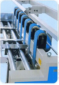 纸板主要是通过二根80mm宽的拐带及二根折叠导管来实现左右两边第二折线和第四折线180度的折叠成形。高摩擦力皮配合多个成形压轮自動折叠紙板,強制校正纸箱成形尺寸。使成箱成形美观且误差小。