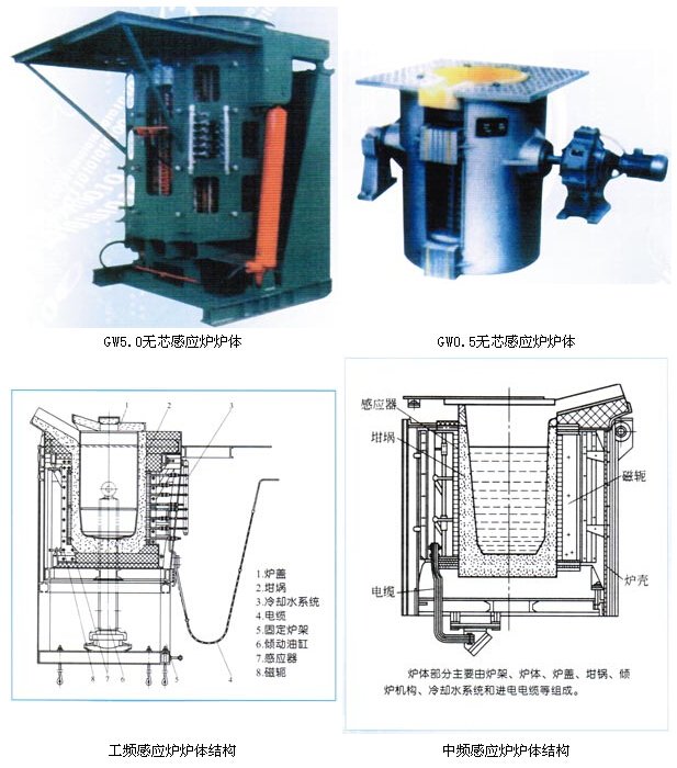 工频无芯炉的外侧多装有导磁体,作为磁屏蔽。炉架、感应线圈、坩埚和导磁体组成