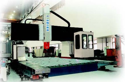 两系列机床的结构特点是:整机采用固定式床身工作台,龙门框架沿床身导轨纵向移动(X轴);溜板沿横梁导轨横向移动(Y轴);滑枕安装在溜板上,滑枕沿溜板导轨垂直升降(Z轴);并且固定安装的双回转摆动铣头既可在水平面内转动(绕Z轴旋转的C轴),也可在垂直面内摆动(当C轴处于零点时,绕Y轴旋转的B轴)。