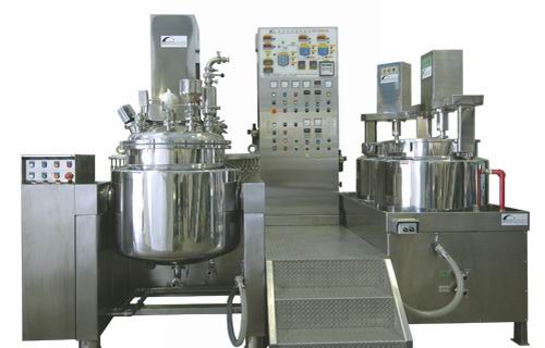 该种型号乳化锅是在引进设备的基础上改进的,是目前国内生产中高档乳剂,膏霜类产品必备设备,设计合理、工艺先进,各项技术参数均可与国际八十年代同类产品相比美,比意大利TE-3型和日本YQ型真空均质乳化锅均质系统的剪切次数大2倍以上,物料均质后细腻均匀、光亮度特别好。该设备的均质系统采用推进挤压蜗轮剪切结构,物料由推进叶轮送至均质机,通过叶齿蜗轮(动态)和二个固定齿圈进行均质工作,当叶轮高速旋转时产生的吸力将物料先后推进挤压和蜗轮剪切达到均质目的。均质机工作时,可根据物料粘度的不同情况,关闭锅体与均质机管路之间的阀门进行内循环和外循环均质,可以保证全部物料有机会均等乳化。同时,均质机可兼作出料泵和清洗泵之用。先进的刮板搅拌器在运转时产生的离心率作用下聚四氟乙烯刮板紧贴锅壁,有效地解决了锅壁沾料问题,不留死角,理想的变频调速装置可使其转速任意无级调速。该设备在锅台上装有独特的视镜装置,配有封闭式照明灯,供操作人员随时观察物料乳化情况。整套设备加热、冷却在同一夹套内完成,夹套外设有硅酸铝保温层,层外有抛光至镜面的不锈钢装饰板,一则可节省加热、冷却时间,二则可防止操作工人烫伤,确保生产安全。