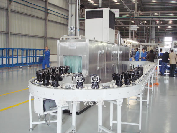 工艺流程:人工上件→连续通过清洗室→漂洗室→压缩空气吹水室→热风烘干室→人工下件。