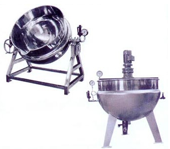 可倾式球形夹层锅由主体, 支架, 蜗轮, 蜗杆等部件组成, 锅体可作1800C以内的转动, 本设备为敞楼式浓缩, 主要用于制药, 食品, 化工等行业对液料的煎煮和浓缩. 该设备与物料接触部分为不锈钢, 具有较好的腐蚀性能, 经久耐用, 符合药品卫生要求. 同时也可根据用户要求, 增封闭式带搅拌装置及固定式系列等.