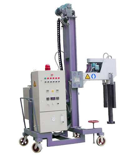 除气机是一种装有进口液压升降机(或是机械升降系统)的手推车式带在线测量铝液温度的旋转转子除气设备,除气介质采用99.996%的氩气或氮气,其原理是:在除气机上装上石墨转子后放置在铝液中,通过受控的旋转石墨轴和转子,将计量的惰性气体压入铝液中并打散成微小气泡,使其均匀地分散在液融金属中气泡的气分压为零。由于铝液中的氢分压高、所以铝液中的氢不断向气泡中扩散,同时铝液中的非金属夹杂被吸附在气泡表面,无用的氢气和非金属夹杂物粘附的惰性气体气泡上浮至液面上,处理完毕,石墨转杆自动升起,进行撇渣达到了除氢和氧化夹杂物的目的。除气臂上加装有在线的铝液温度测量装置,能够在除气的时候了解铝液温度的变化,便于操作人员了解铝液是否符合浇铸温度要求。设备能很灵活地移动,可方便地放置在车间的任何地方。惰性气体既可由供气中心提供亦可用钢瓶装在小车旁,随机移动。 用途:用于坩锅、坩锅炉、汲料井、铝水抬包等的脱气。