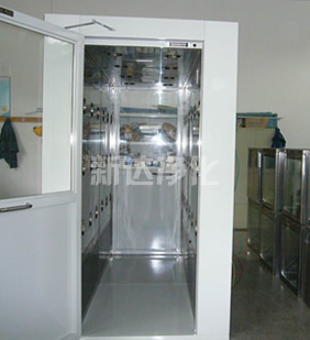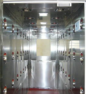 风淋室是人进入洁净室所必需的通道,是洁净厂房的必要设备,它可减少人以进出洁净室所带来的污染问题。风淋室的两道门电子互锁,可以兼起气闸室的作用,防止未被净化的空气进入洁净室,降低人员出入洁净室过程中尘埃对洁净室的污染。当人员进入风淋室后,高速洁净气流经高效空气过滤器过滤后由可旋转喷嘴从各个方向喷射至人身上,有效而迅速清除衣着所携带的尘埃粒子,带有尘埃粒子的空气再由初、高效过滤器过滤后重新循环到风淋区域内。