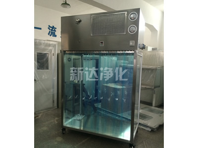 洁净层流罩是将空气以一定的风压通过高效空气过滤器后,使洁净空气呈垂直单向流气流形式送入工作区,从而保证了工作区内达到工艺要求的洁净度。