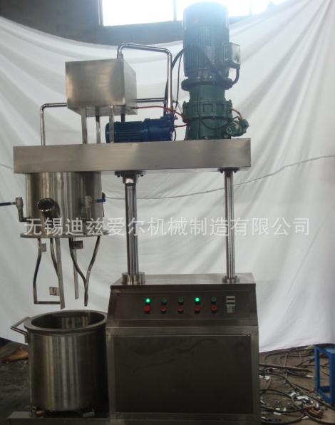 特点:行星架转动时,带动箱内的三根搅拌轴围绕料桶公转的同时,搅拌轴高速自转,从而使物料受到强烈的剪切、捏合作用,达到充分分散和混合的目的,在行星架上有一刮壁刀随行星架转动,不断的挂拭桶壁,使桶壁无滞留料,提高混合效果。本装置能在真空下工作,能不断排出水分及其他挥发物,因此,可作为脱气釜使用。根据需要,料桶可以制造为油、水循环加热或冷却,设备的机架、封盖及搅拌器由双柱液压升降、操作平稳、快捷、轻便。本设备还可以实现一个单元的工艺时间自动控制。