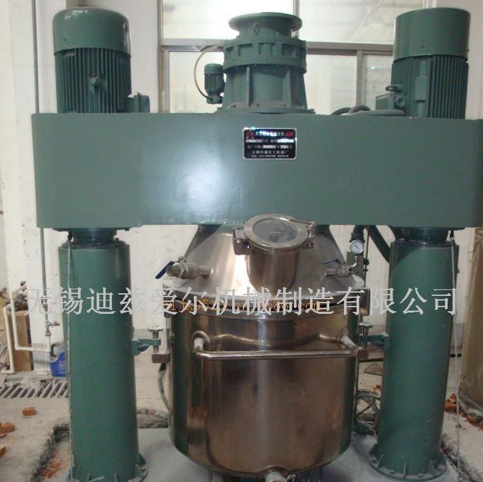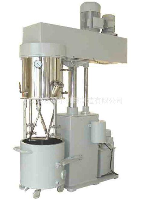 特点:行星架转动时,带动箱内的三根搅拌轴围绕料桶公转的同时,搅拌轴高速自转,从而使物料受到强烈的剪切、捏合作用,达到充分分散和混合的目的,在行星架上有一刮壁刀随行星架转动,不断的挂拭桶壁,使桶壁无滞留料,提高混合效果。本装置能在真空下工作,能不断排出水分及其他挥发物,因此,可作为脱气釜使用。根据需要,料桶可以制造为油、水循环加热或冷却,设备的机架、封盖及搅拌器由双柱液压升降、操作平稳、快捷、轻便。本设备还可以实现一个单元的工艺时间自动控制。
