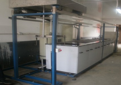 荧光液探伤超声波清洗机由操作者将待清洗的工件依次放入工装篮内,人工推到上料处PLC得到信号后,由机械手依次送至各个工位进行超声波清洗、热风干燥、冷却、荧光液渗透、漂洗、热风干燥处理后、自动至下料推车上,操作者将推车推出,工件取下,转入下道工序即可。 设备有活性炭过滤循环装置,进水阀门、出水阀门,进出料推车,全自动机械手,热风循环装置,整机监控系统,加热系统,超声波系统,电器控制部分,整机清洗部分为半封闭结构,(仅封闭槽体前面)侧面和机械手部分为敞开式结构