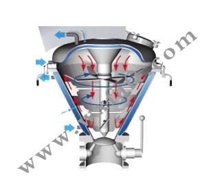 原理:VC混合机具有锥形混合腔体,并配有中心转轴,其旋转速度可达30米/秒。通过转轴的速度产生离心力将产品推向混合腔体内壁。 此时腔体的锥形形状及刀片的形状使产品产生一个沿内壁向上的运动。产品再由特别设计的混合机盖引导到混合机的中心,并回落到混合腔的底部,重新开始新一轮的混合过程。