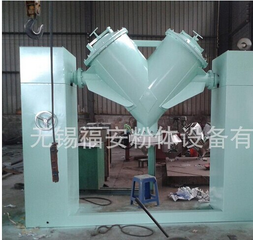 本机适用于粉体的均匀混合,比一般的混料 机设计更合理,混合效率更高,操作更简便。 V型混料桶一般用不锈钢制作,内外壁抛光,结构设计上无死角,清洗方便;彻底。筒体上部有死口,清洗时打开,分别将不同的物料加入,下部有一个出料口。筒体可由手轮控制并转动至任意角度,以便于出料。根据用户要求可采用其它材质,或者内衬聚氨纸。筒体回转时间可用时间继电器任意控制,到达预定时间机器自动停止。在操作面有防护栏杆,机器正常运转时有护栏挡住,可以确保操作人员的安全。大型的V型混料机,配有操作平台,以便于操作和维护。本机可根据用户需要加强制搅拌氮气保护加湿系统等装置。其中带强制搅拌器,其混合的均匀度可达到99.99%。