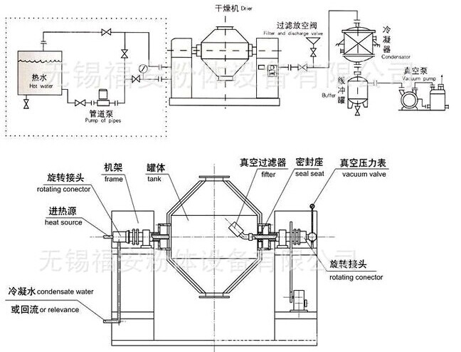 双锥回转真空干燥机是集混合—干燥于一体的新型干燥机。将冷凝器,真空泵与干燥机配套,组成真空干燥装置。容器不断旋转,物料加热表面得以更新;间接加热,不会被污染;热效率高,比一般烘箱提高2倍以上。(如不需回收溶剂,冷凝器可不用)本机设计先进,内部结构简单,清洗容易,物料能全部排出,操作简单。能降低劳动强度,改善工作环境。同时因容器本身回转时物料亦转动,但器壁上不积料,故传热系数较高,干燥速率大,不仅节约能源,而且物料干燥均匀充分,质量好。可广泛应用于制药、化工、食品、染料等行业的干燥,符合药品管理规范“GMP”的要求。